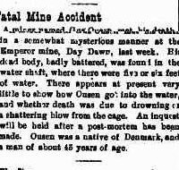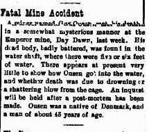 A miner named Gus Ousen met his death in a somewhat mysterious manner at the Emperor mine, Day Dawn, last Tuesday-His dead body, badly battered, was found in the water shaft where there was five or six feet of Water. There appears at present very little to show how Ousen got into the water, and whether the death was due to drowning or a shattering blow from the cage.