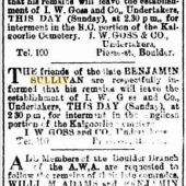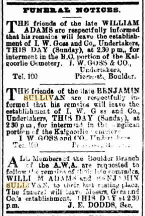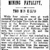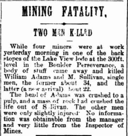 Adams and Sullivan were a little in advance of their companions, and were shovelling a lot of loose stuff away. There was apparently nothing that indicated impending danger. Just then, however, there was a rumbling noise, and Collopy and the Austrian were horrified to see a big boulder break away and carry with it their two mates, William ADAMS and Benjamin SULLIVAN.