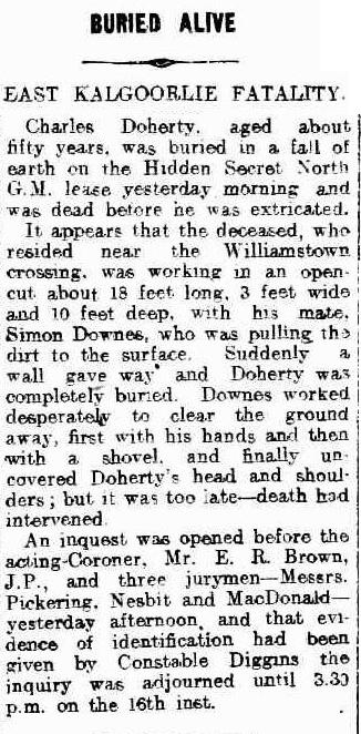 FUNERAL NOTICES. DOHERTY.— The friends of the late Charles Doherty are respectfully informed that his remains will be removed THIS DAY (Friday), at 2 o'clock, from. St. Mary's Church for interment in, the Catholic portion of the Kalgoorlie Cemetery.. — Mannion and Cruse, Undertakers, Hanann st. Tel. 327.