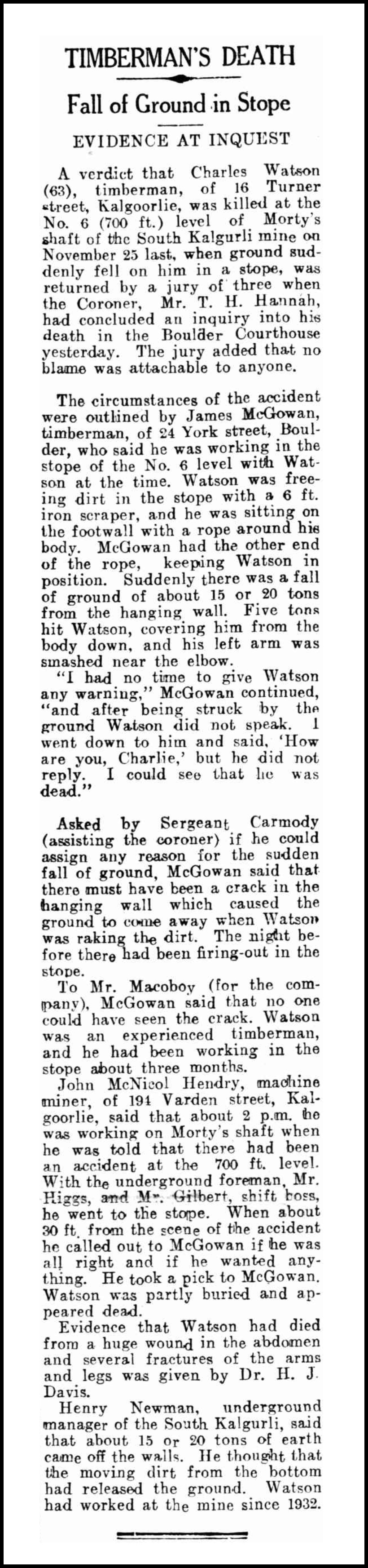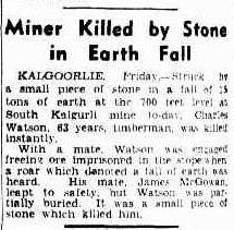 Killed by a fall of earth in the Monty's Shaft of the South Kalgurli GM.