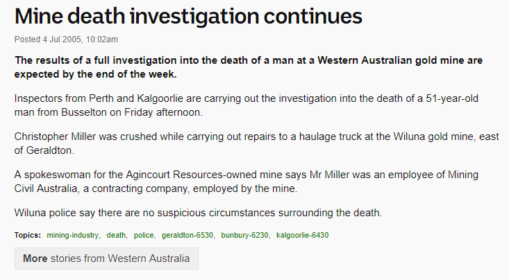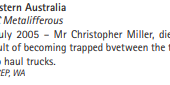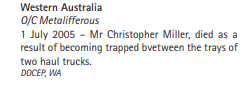 Mr Christopher Miller died as a result of becoming trapped between the trays of two haul trucks.