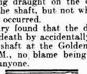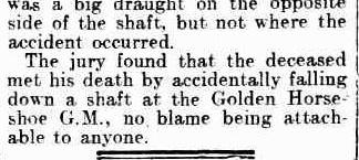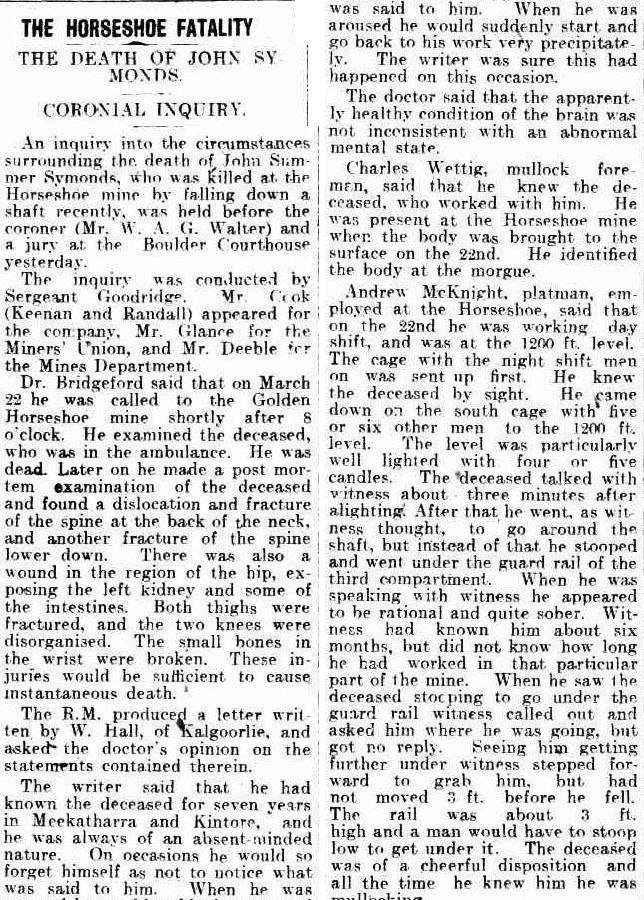 The Coronial Inquiry found that Mr Symonds met his death by accidentally falling down a 192-foot deep shaft in the Golden Horseshoe GM. The Doctor who conducted the post-mortem stated that the injuries received from this fall would have been sufficient to cause instantaneous death.