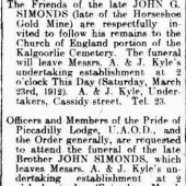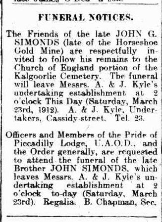 SYMONDS spelled as SIMONDS in the Funeral Notice in the Kalgoorlie Miner of March 23rd, 1912.