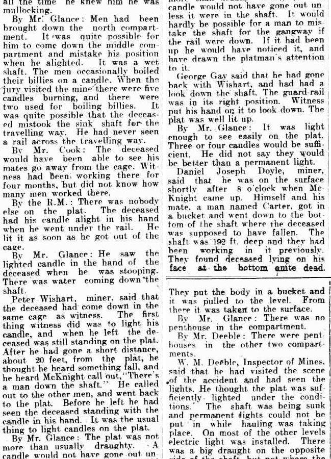 On the day of his death, Mr. Symonds came down to the 1200-foot level of the mine in the cage with 5 or 6 other men. This level was described as being particularly well lit with 4 or 5 candles. After talking to men at this level for a few minutes, Mr. Symonds stooped and went under the 3-foot-high guardrail of the third compartment. Mr. Symonds then moved forward only a few feet before falling down the sink shaft to his death.