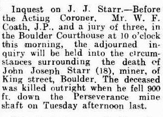 Inquest: https://trove.nla.gov.au/newspaper/article/34633928?searchTerm=%22Fatal%20Fall%20Down%20Shaft%22