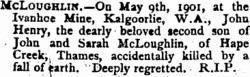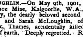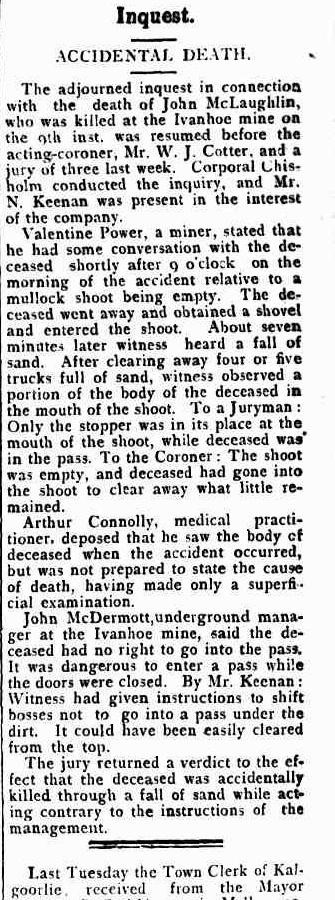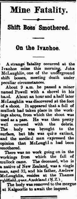 Funeral Notice:- The friends of the late John McLaughlin, late shift boss, Ivanhoe G.M., are respectfully informed that his remains will be removed from the Government Hospital, Kalgoorlie, at 2.30 p.m. This Day (Friday), for interment in Roman Catholic portion Kalgoorlie Cemetery. I. W. Goss and Co., Undertakers, Piesse-street. Tel. 100.