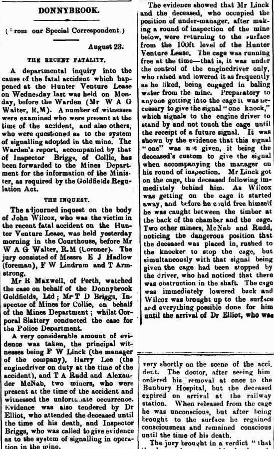 Caught between the timber at the back of the chamber and the cage. The jury brought in a verdict "that the deceased came to his death accidentally, and that they considered that he contributed to his own death by omitting to give a proper signal to the engine driver".