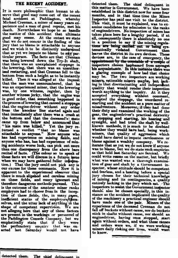 While Crennan was being lowered down the Try-It shaft, Paddington, there was an unexplained stoppage in the lowering, followed by an unauthorised restarting, and Crennan fell to the bottom from such a height as to be instantly killed.
