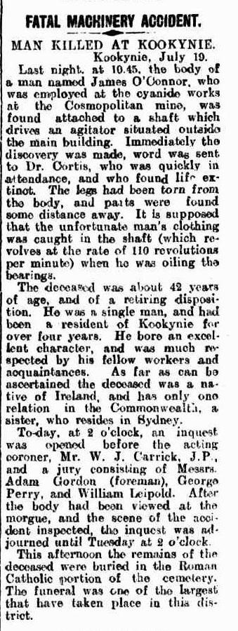 As far as can be ascertained the deceased was a native of Ireland, and has only one relation in the Commonwealth, a sister, who resides in Sydney. Probate:- James O'Connor, Kookynie, £119.