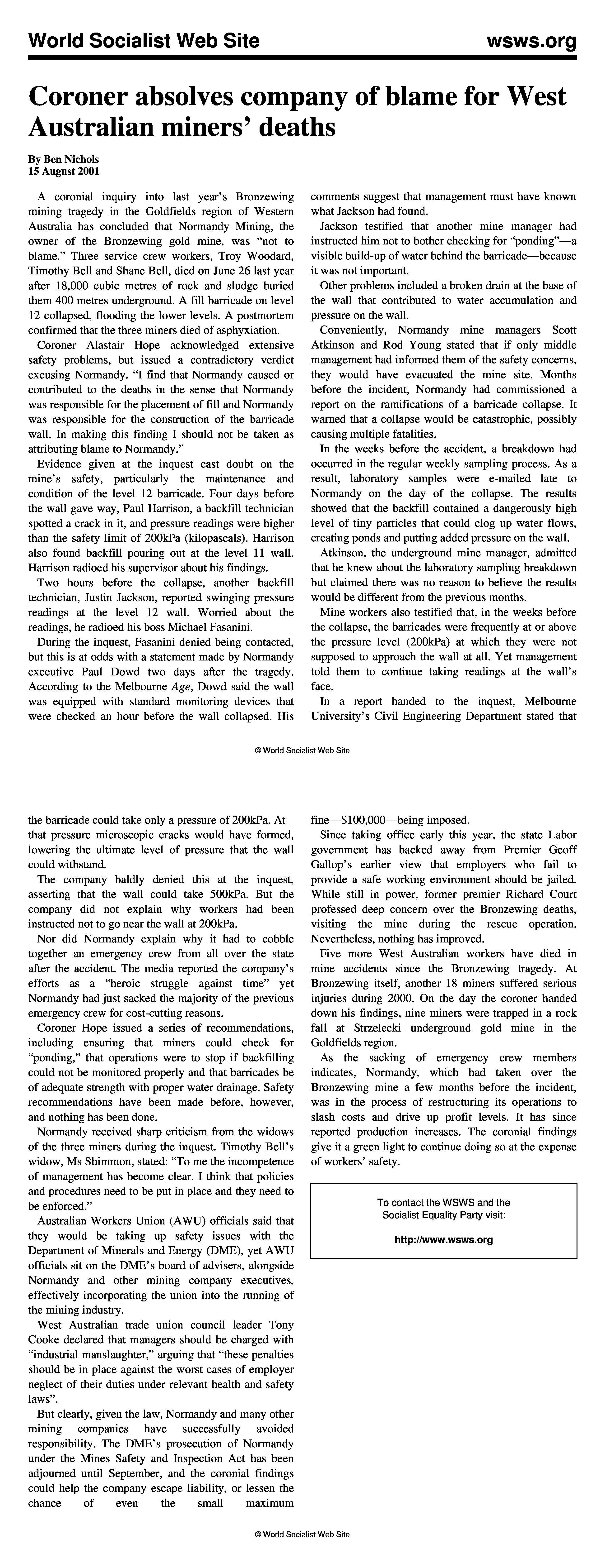 • Coroner absolves company of blame for West Australian miners’ deaths. By Ben Nichols 15 August 2001. World Socialist Web Site