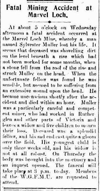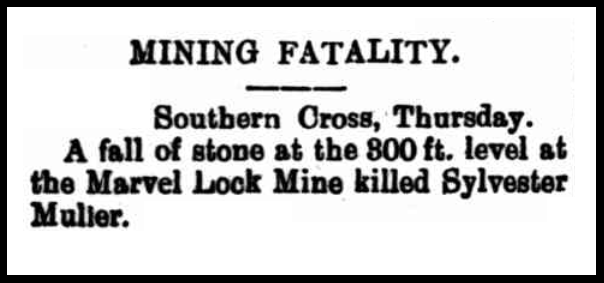 Late last night, word was received in Southern Cross from Marvel Loch, that at about 5 o'clock in the afternoon, Sylvester Muller was killed by a fall of stone in the 300ft level in the Marvel Loch GM.