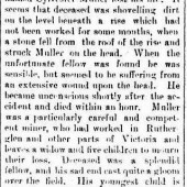 From the information obtainable it appears that while Muller was working in a stope about a hundredweight of stone came down, striking the unfortunate man on the head and shoulder. He was immediately conveyed to the surface, and it was at once seen that he was seriously injured. He lingered for about an hour and then expired. The deceased leaves a widow and five children, for whom much is felt.