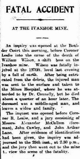 The funeral of the late William Reuben Wilson., shift boss at the Ivanhoe mine, who was killed on Monday evening last, took place yesterday when a. large number of the deceased's friends and, fellow workers attended. The cortege moved from the deceased's late residence a£ .11 o'clock, and proceeded to All Hallow's Church, Moran Street, where a service was conducted- by the Rev. Father Kiely. After the service, a large number of men comprising the deceased's mates and fellow workers, members of the Miners' Union, Ivanhoe Football Club, and the Druids' Ledge, of which the deceased was a member, followed the remains to their last resting place, in the Roman Catholic portion of the Boulder Cemetery.